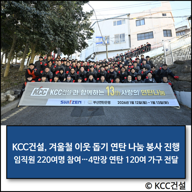 KCC건설은 지난 2014년 1월부터 매년 연탄 나눔을 이어오고 있다. 이번 활동까지 총 13회에 걸쳐 누적 기부량 47만 장을 달성했다. 이는 지역 저소득층 가구의 겨울나기에 실질적인 도움을 제공한다는 점에서 의미가 크다.