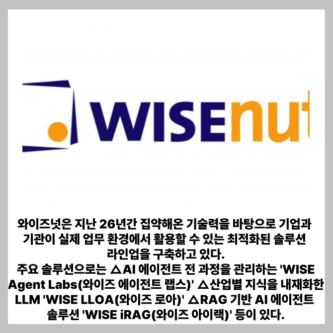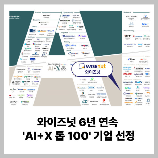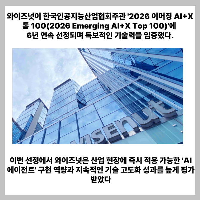 [프라임경제] 와이즈넛(096250, 대표 강용성)이 한국인공지능산업협회(AIIA) 주관 '2026 이머징 AI+X 톱 100(2026 Emerging AI+X Top 100)'에 6년 연속 선정됐다고 13일 밝혔다.