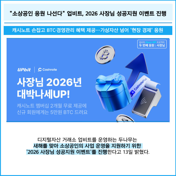 [프라임경제] 디지털자산 거래소 업비트를 운영하는 두나무는 새해를 맞아 소상공인의 사업 운영을 지원하기 위한 '2026 사장님 성공지원 이벤트'를 진행한다고 13일 밝혔다.