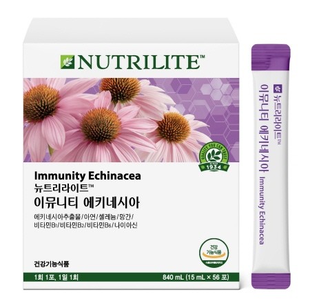 '뉴트리라이트 이뮤니티 에키네시아'는 1포(15ml) 기준으로 식품의약품안전처 일일 섭취 기준을 100% 충족하는 에키네시아추출물 200mg을 함유했다. 여기에 정상적인 면역 기능과 항산화에 필요한 아연·셀레늄·망간, 에너지 대사에 도움을 주는 비타민 B1·B2·B6·나이아신 등 총 8가지 주원료를 담았다. 이를 통해 면역력과 항산화, 에너지 기능을 함께 고려한 '8중 복합기능성 토탈 디펜스 포뮬러'를 구현했다.