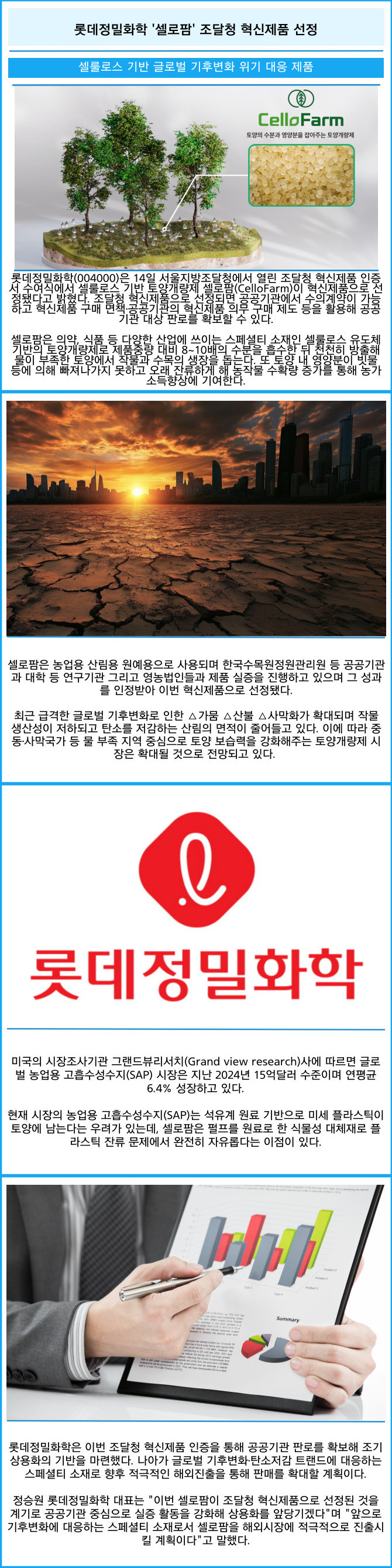 [프라임경제] 롯데정밀화학(004000)은 14일 서울지방조달청에서 열린 조달청 혁신제품 인증서 수여식에서 셀룰로스 기반 토양개량제 셀로팜(CelloFarm)이 혁신제품으로 선정됐다고 밝혔다. 조달청 혁신제품으로 선정되면 공공기관에서 수의계약이 가능하고 혁신제품 구매 면책·공공기관의 혁신제품 의무 구매 제도 등을 활용해 공공기관 대상 판로를 확보할 수 있다.
