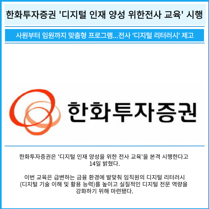 [프라임경제] 한화투자증권(003530)은 '디지털 인재 양성을 위한 전사 교육'을 본격 시행한다고 14일 밝혔다.