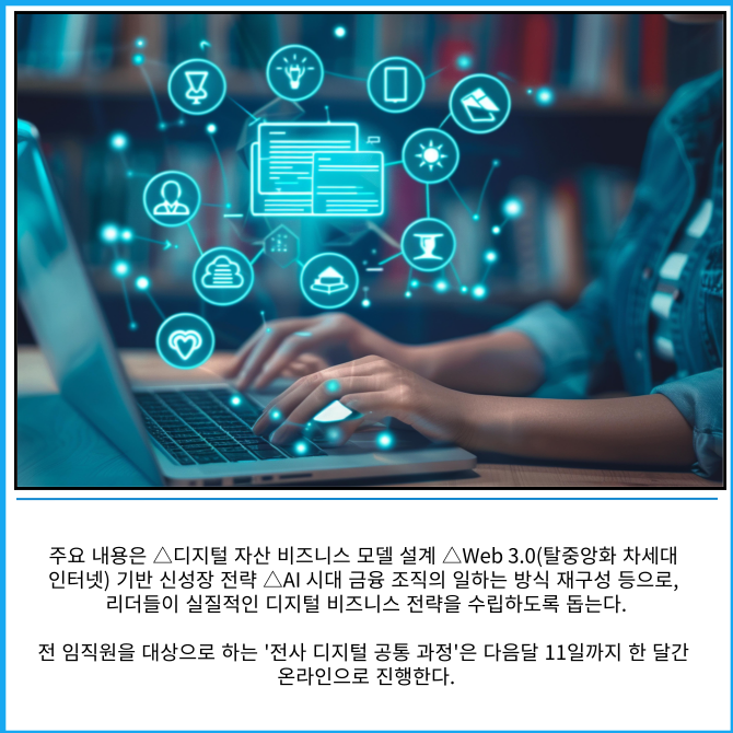 이번 교육은 급변하는 금융 환경에 발맞춰 임직원의 디지털 리터러시(디지털 기술 이해 및 활용 능력)를 높이고 실질적인 디지털 전문 역량을 강화하기 위해 마련됐다.
