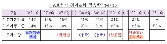 제도 시행 시점은 2027년 1월1일이다. 다만 적기시정조치 부과에는 2035년 12월까지 총 9년간의 경과기간이 적용된다. 2027년 3월 말 기준 기본자본비율이 50%에 미달하는 보험사에는 분기별 '최저 이행기준'이 부과된다. 이를 2년 연속 충족하지 못할 경우 경과조치가 종료되고 적기시정조치가 내려진다.
