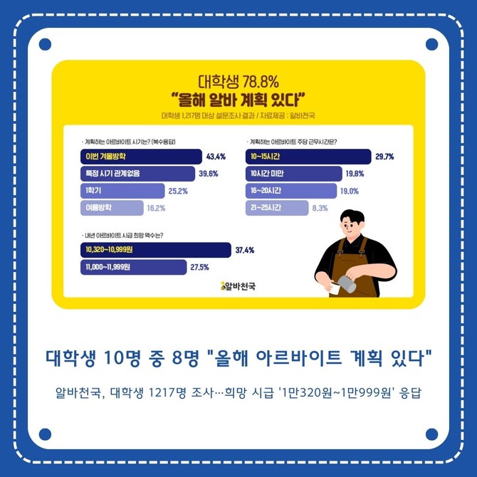 알바천국, 대학생 1217명 대상 설문조사…희망 시급 '1만320원~1만999원' 응답