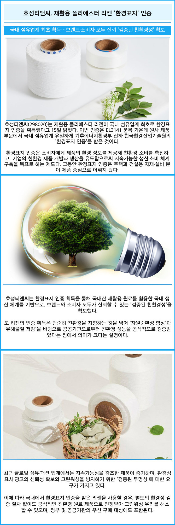 [프라임경제] 효성티앤씨(298020)는 재활용 폴리에스터 리젠이 국내 섬유업계 최초로 환경표지 인증을 획득했다고 15일 밝혔다. 이번 인증은 EL3141 품목 가운데 원사 제품 부문에서 국내 섬유업계 유일하게 기후에너지환경부 산하 한국환경산업기술원의 '환경표지 인증'을 받은 것이다.