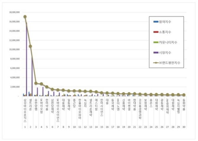 1월 제약 상장기업 브랜드평판 순위는 △삼성바이오로직스 △셀트리온 △유한양행 △SK바이오팜(326030) △한미약품(128940) △삼천당제약(000250) △SK바이오사이언스(302440) △대웅제약(069620) △일동제약(249420) △종근당(185750) △한올바이오파마(009420) △녹십자(006280) △셀트리온제약(068760) 순으로 나타났다.