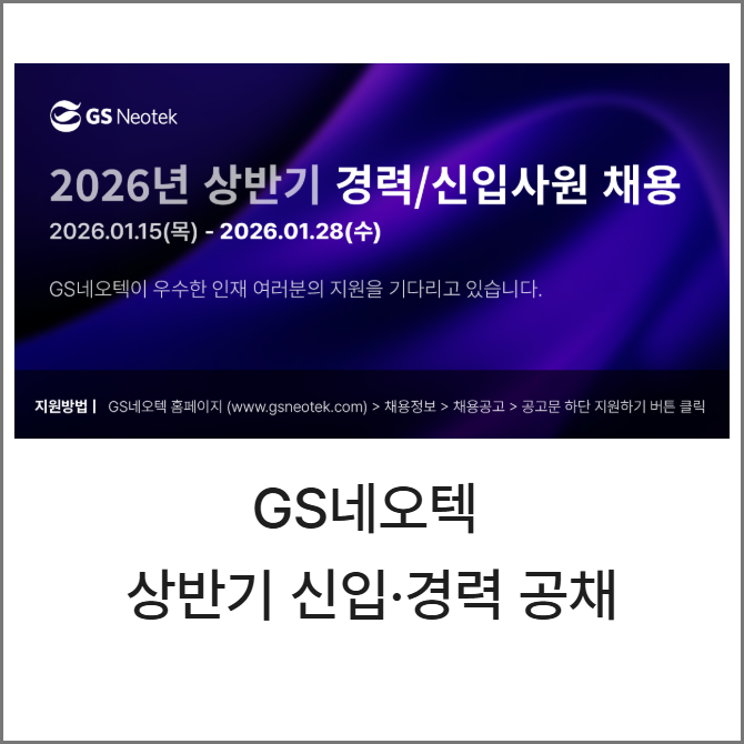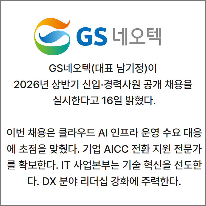 [프라임경제] GS네오텍(대표 남기정)이 2026년 상반기 신입·경력사원 공개 채용을 실시한다고 16일 밝혔다.