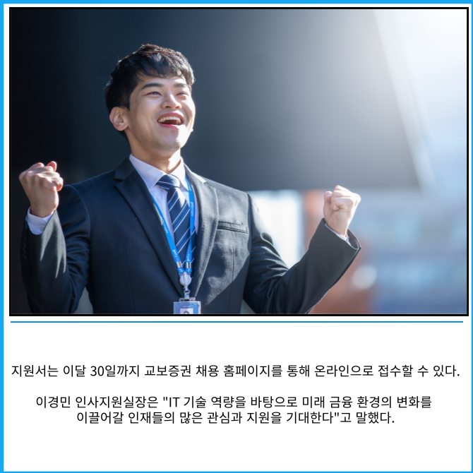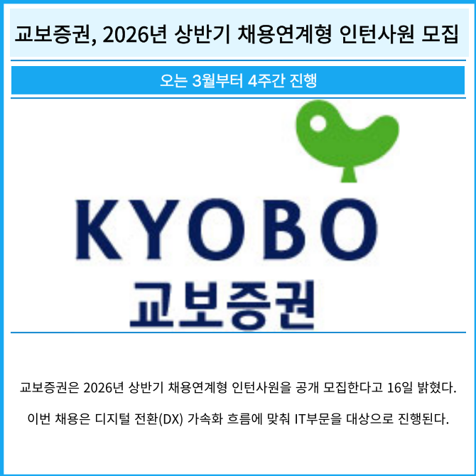 [프라임경제] 교보증권(030610)은 2026년 상반기 채용연계형 인턴사원을 공개 모집한다고 16일 밝혔다.