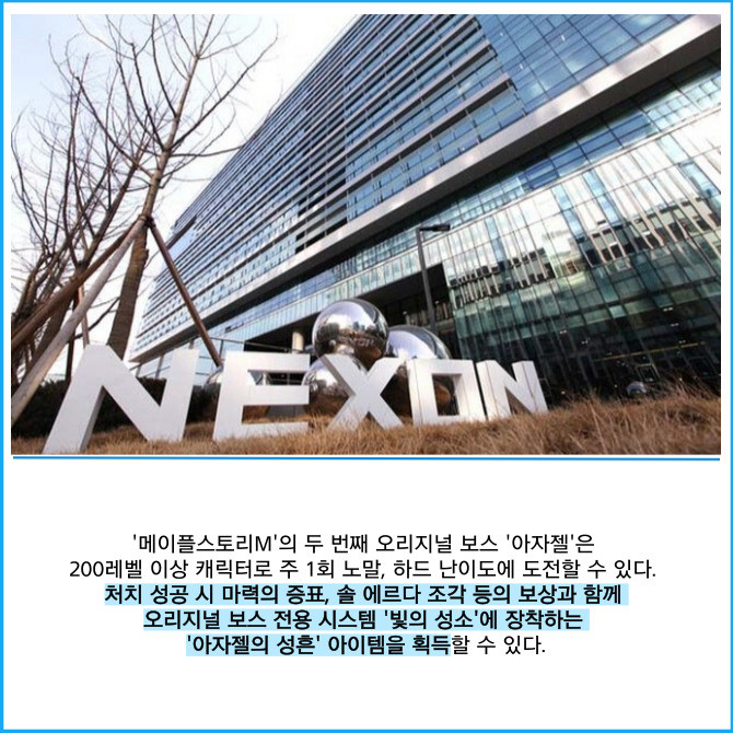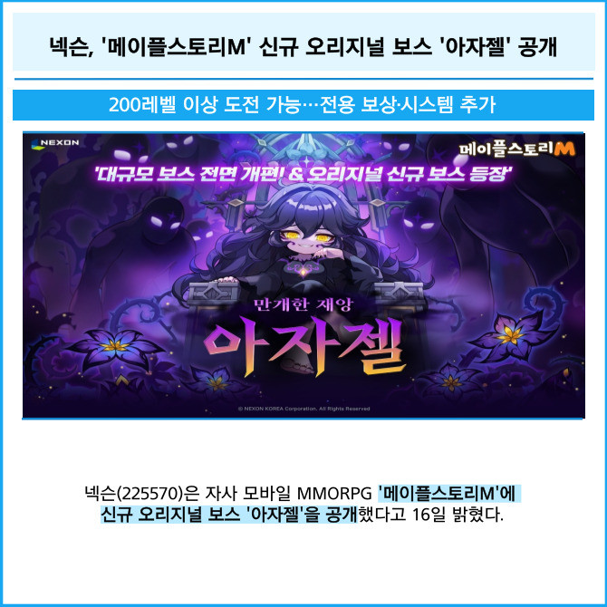 [프라임경제] 넥슨(225570)은 자사 모바일 MMORPG '메이플스토리M'에 신규 오리지널 보스 '아자젤'을 공개했다고 16일 밝혔다.