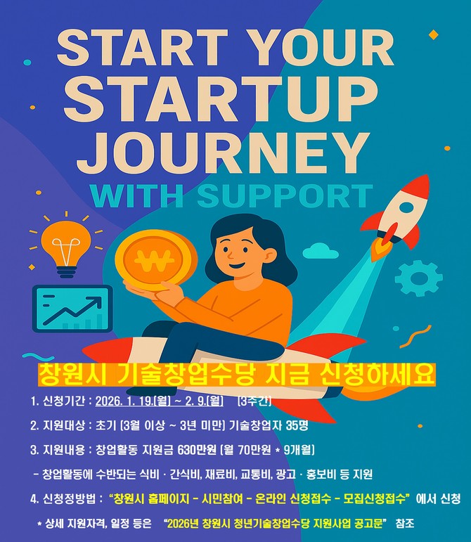 창원시는 오는 1월19일부터 2월9일까지 '2026년 청년기술창업수당 지원사업' 참여자 35명을 모집한다고 밝혔다.