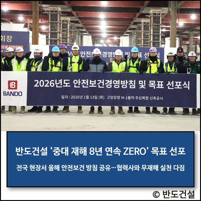 반도건설은 지난 13일부터 14일까지 양일간 전국 현장에서 협력사와 '중대 재해 8년 연속 ZERO'를 위한 '2026년 안전보건 방침 및 목표 선포식'을 개최했다고 15일 밝혔다.