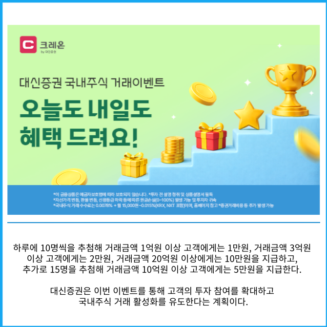 [프라임경제] 대신증권은 개인 투자자의 국내 주식 거래를 장려하고 실질적인 수익 기회를 지원하기 위해 거래 이벤트 '오늘도 내일도 혜택'을 이달 30일까지 진행한다고 16일 밝혔다.