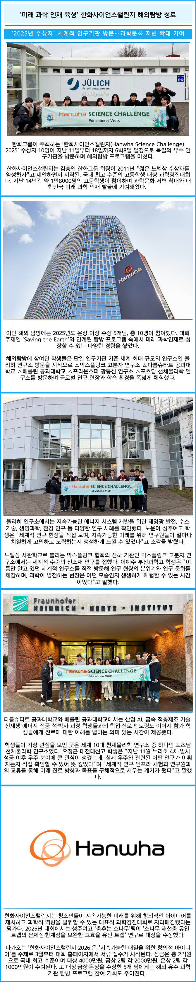 [프라임경제] 한화그룹이 주최하는 '한화사이언스챌린지(Hanwha Science Challenge) 2025' 수상자 10명이 지난 11일부터 18일까지 6박8일 일정으로 독일의 유수 연구기관을 방문하며 해외탐방 프로그램을 마쳤다.