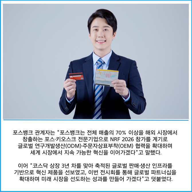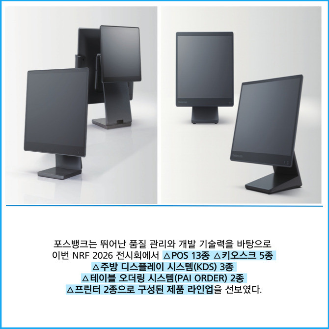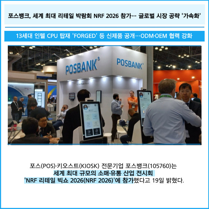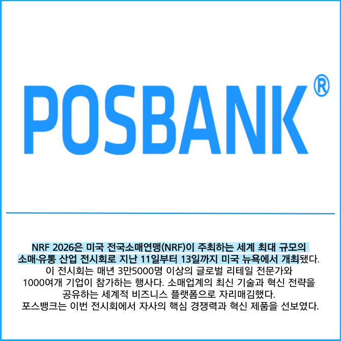 [프라임경제] 포스(POS)·키오스트(KIOSK) 전문기업 포스뱅크(105760)는 세계 최대 규모의 소매·유통 산업 전시회 'NRF 리테일 빅쇼 2026(NRF 2026)'에 참가했다고 19일 밝혔다.
