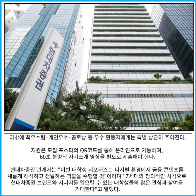 [프라임경제] 현대차증권은 MZ세대와의 소통 강화를 위한 브랜드 캠페인의 일환으로 '대학생 서포터즈 2기'를 모집한다고 19일 밝혔다.