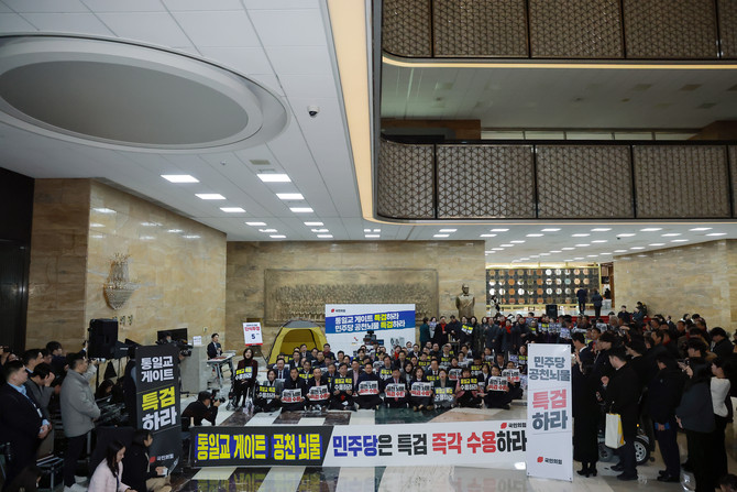 국민의힘은 19일 오후 국회에서 비공개 의원총회를 진행, 장 대표가 단식 농성 중인 로텐더홀에서 의원들을 비롯한 원외 당협위원장 등과 함께 '공천뇌물 특검 수용', '무도한 여당 야당 탄압 중단'이 적힌 손팻말을 들고 규탄대회를 진행했다.