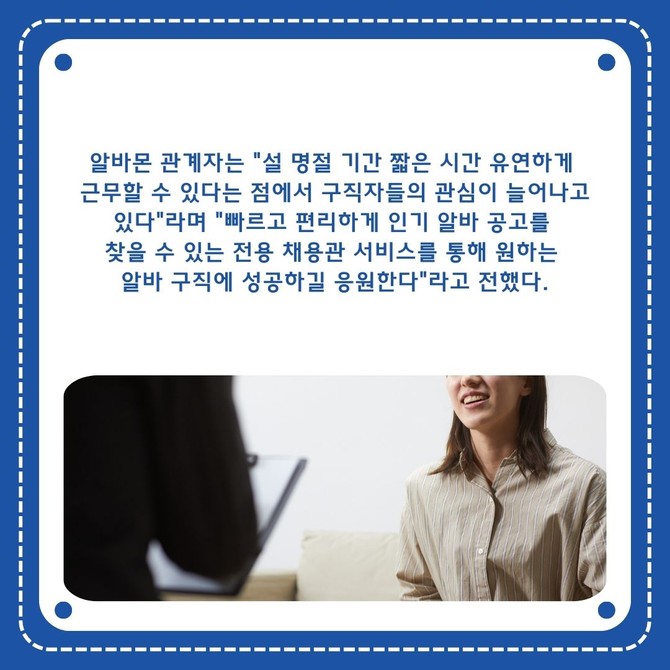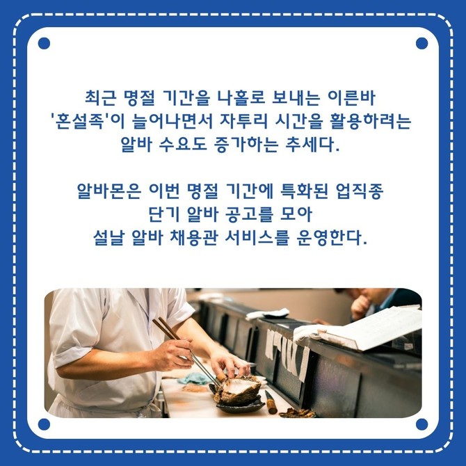 [프라임경제] 알바몬(대표 윤현준)은 설 연휴 기간 아르바이트 희망 구직자를 위한 '설날 알바 채용관'을 오픈했다고 20일 밝혔다.