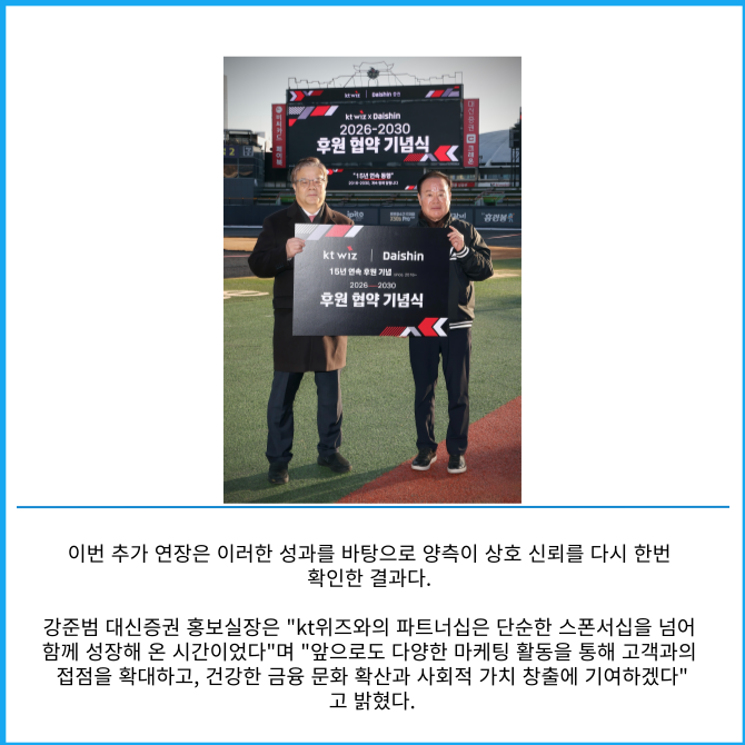 [프라임경제] 대신증권(005340)은 지난 20일 kt위즈파크에서 오익근 대신증권 대표이사와 이호식 kt위즈 대표이사가 참석한 가운데 2026-2030 후원 협약 기념식을 진행했다고 21일 밝혔다.
