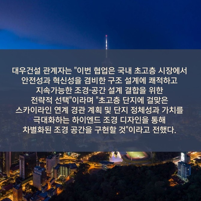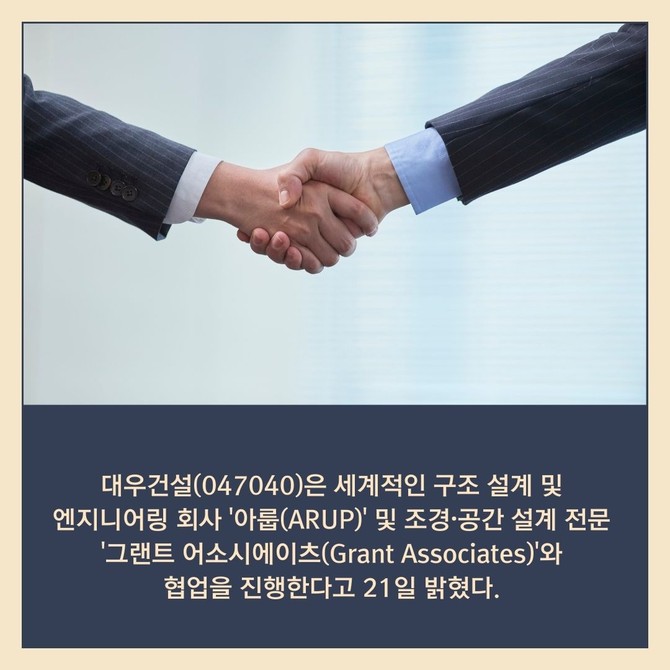 [프라임경제] 대우건설(047040)은 세계적인 구조 설계 및 엔지니어링 회사 '아룹(ARUP)' 및 조경·공간 설계 전문 '그랜트 어소시에이츠(Grant Associates)'와 협업을 진행한다고 21일 밝혔다.
