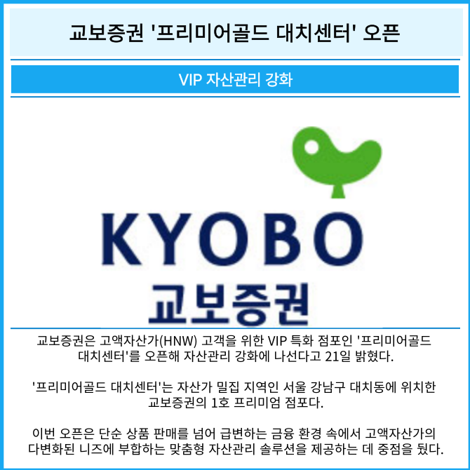 [프라임경제] 교보증권(030610)은 고액자산가(HNW) 고객을 위한 VIP 특화 점포인 '프리미어골드 대치센터'를 오픈해 자산관리 강화에 나선다고 21일 밝혔다.