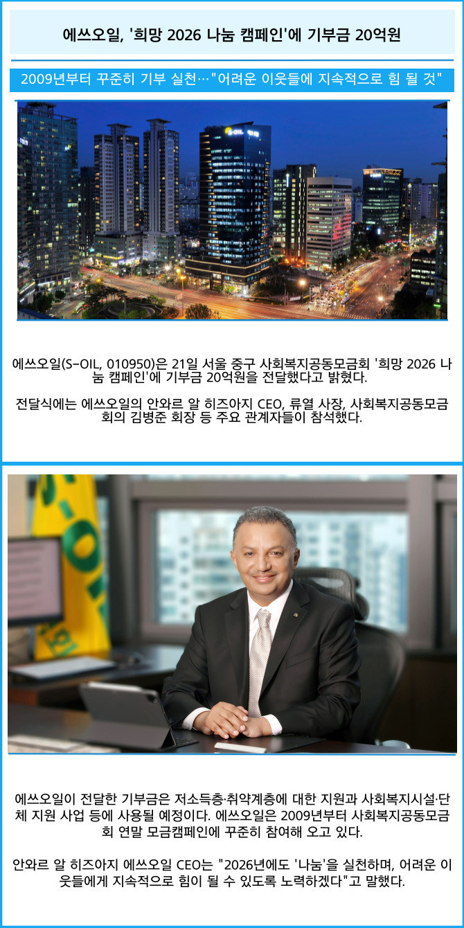 [프라임경제] 에쓰오일(S-OIL, 010950)은 21일 서울 중구 사회복지공동모금회 '희망 2026 나눔 캠페인'에 기부금 20억원을 전달했다고 밝혔다.