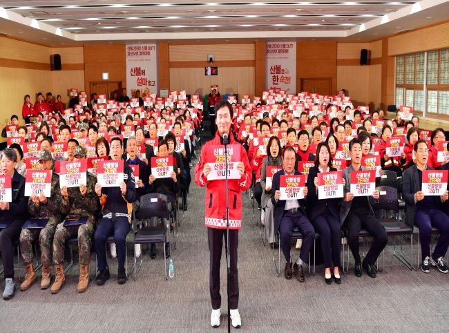 이번 결의대회에는 조현일 경산시장, 이동욱 경산시 의회 부의장 외 도⸱시의원 및 26개 지역기관⸱관변단체장 등 200여 명이 참석한 가운데 △산불 예방 책임 선언문 낭독 △산불 예방 공동 실천 결의문 서명식 △피켓 퍼포먼스 △산불 OUT 퍼포먼스 순으로 진행됐다.