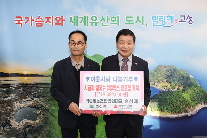 고성군은 손상재 거류영농조합법인 대표가 지난 1월20일 고성군청을 방문해 관내 경로당 어르신들을 위해 시금치 쌀국수 343박스(1852만원 상당)을 기탁했다고 밝혔다.