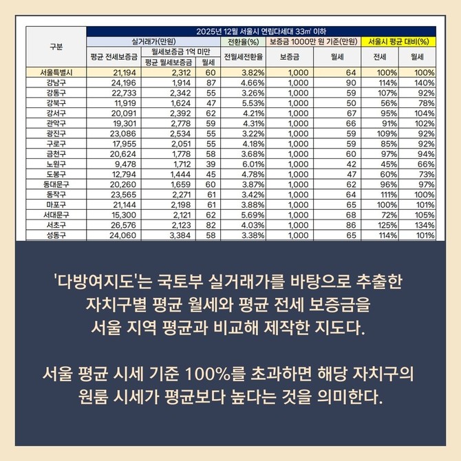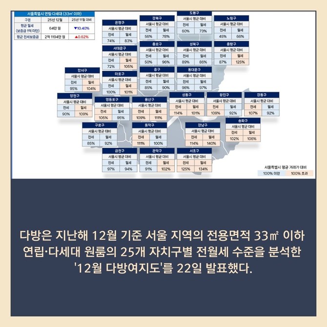 [프라임경제] 다방은 지난해 12월 기준 서울 지역의 전용면적 33㎡ 이하 연립·다세대 원룸의 25개 자치구별 전월세 수준을 분석한 '12월 다방여지도'를 발표했다고 22일 밝혔다.