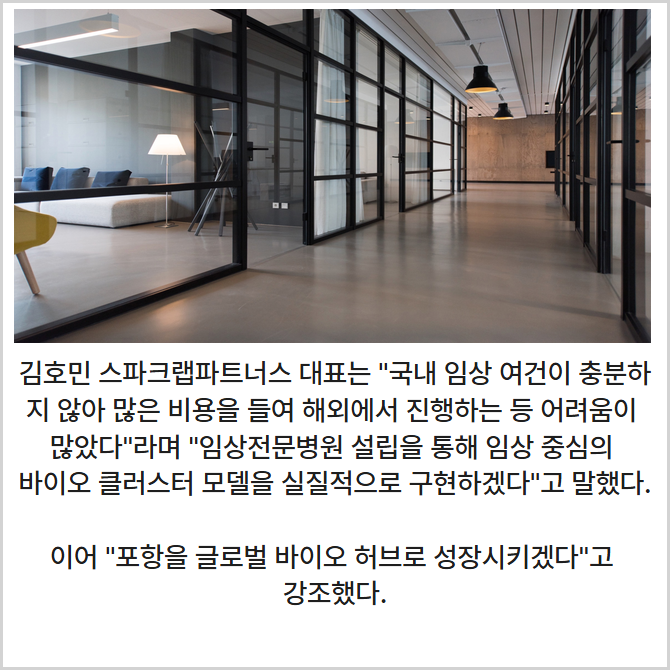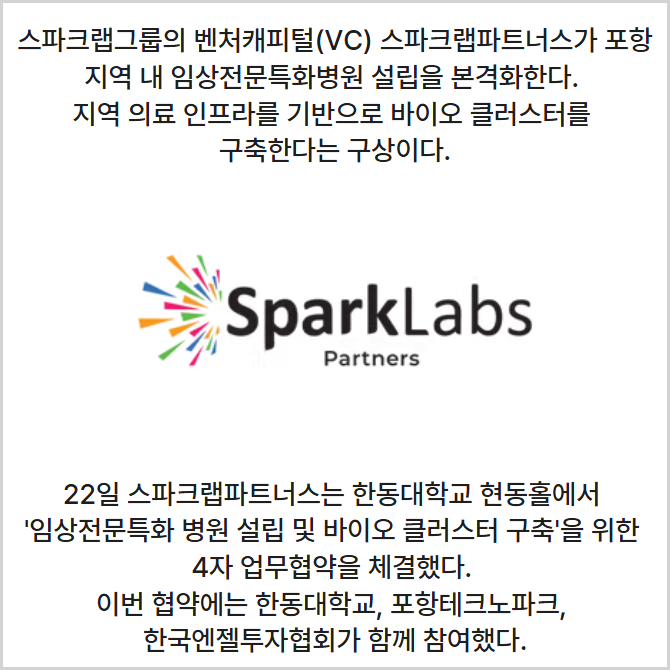 [프라임경제] 스파크랩그룹의 벤처캐피털(VC) 스파크랩파트너스가 포항 지역 내 임상전문특화병원 설립을 본격화한다고 22일 밝혔다.