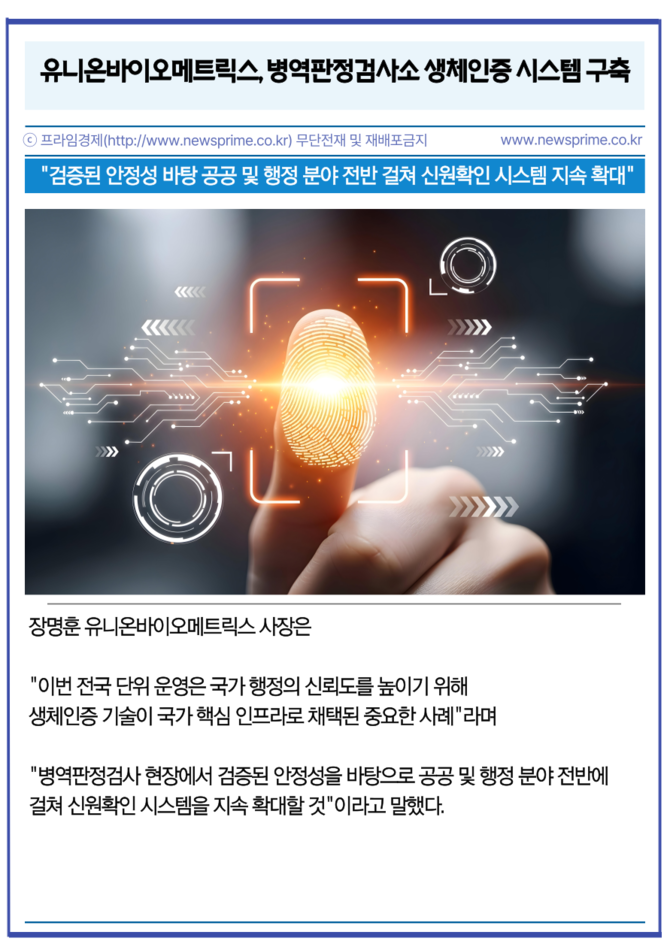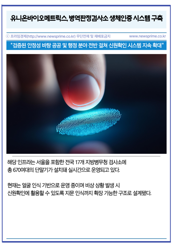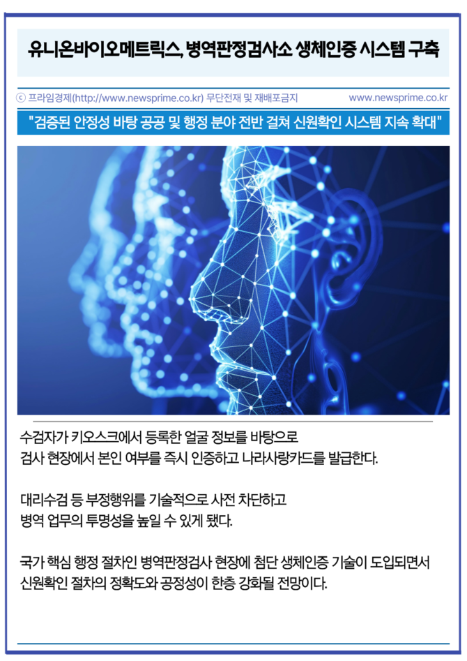[프라임경제] 인공지능(AI) 생체인식 전문기업 유니온바이오메트릭스(203450)는 병무청의 '나라사랑카드 발급 및 운영시스템 구축 사업'을 완료하고 전국 병역판정검사소에서 생체인증 기반 본인확인 시스템 운영을 시작했다고 22일 밝혔다.