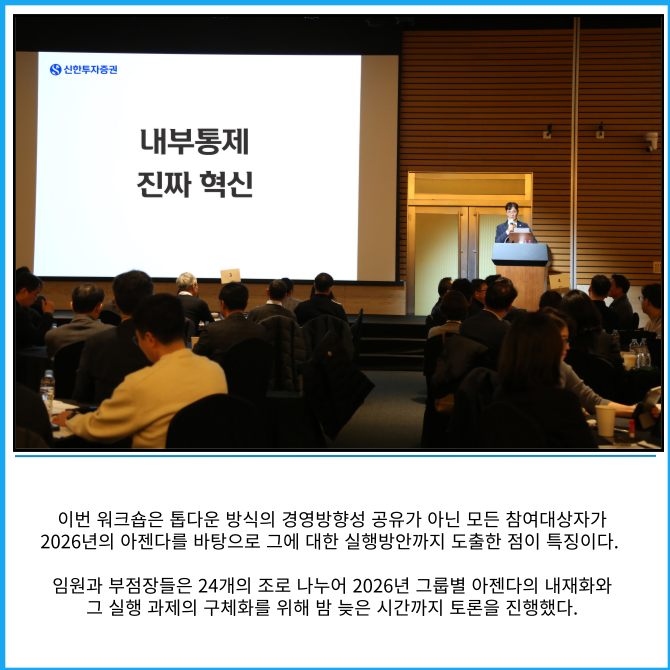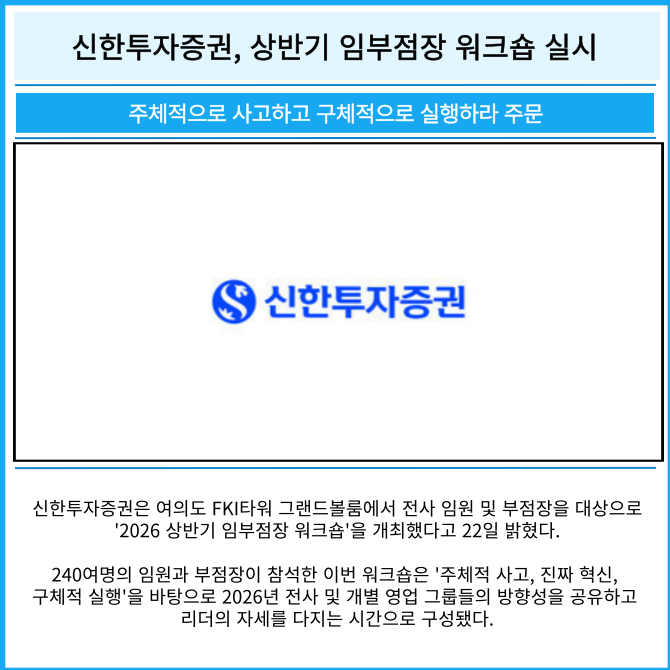 [프라임경제] 신한투자증권은 여의도 FKI타워 그랜드볼룸에서 전사 임원 및 부점장을 대상으로 '2026 상반기 임부점장 워크숍'을 개최했다고 22일 밝혔다.