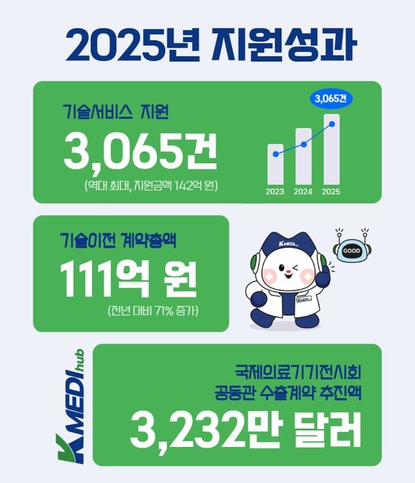 K-MEDI hub는 작년 한 해 동안 기술서비스 지원건수와 금액을 각 3065건, 142억원 달성했다. 특히, 지원금액은 전년 대비 13% 증가해 기업 맞춤형 지원체계 구축과 고난도 기술지원 역량 강화 노력이 빛을 발했다.