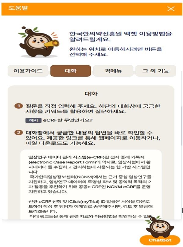 맥챗은 한국한의약진흥원이 보유·관리 중인 한의약 데이터를 기반으로 구축된 서비스로, 한의표준임상진료지침(CPG) 관련 정보와 한의약 제도·연구·기초 정보 등이 폭넓게 포함되어 있다.