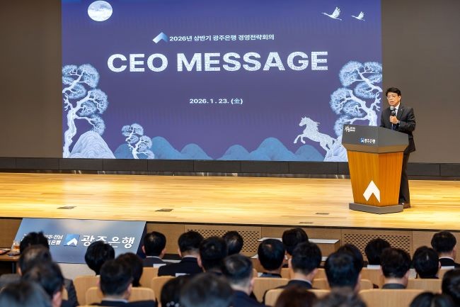 광주은행(은행장 정일선)은 지난 23일 본점에서 2026년 상반기 경영전략회의를 열었다. 이번 회의에서는 2025년 하반기 경영 실적을 점검하고, 2026년 상반기 경영 방향과 추진 전략을 임직원과 공유했다.
