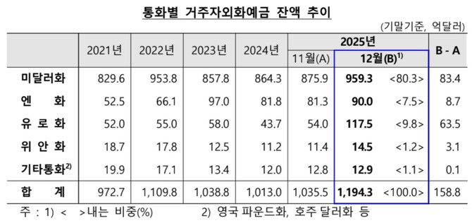 26일 한국은행(이하 한은)이 발표한 '12월 중 거주자 외화예금 동향'에 따르면 지난해 12월 말 외국환은행의 거주자 외화예금 잔액은 1194억3000만달러로 전월 대비 158억8000만달러 늘었다.