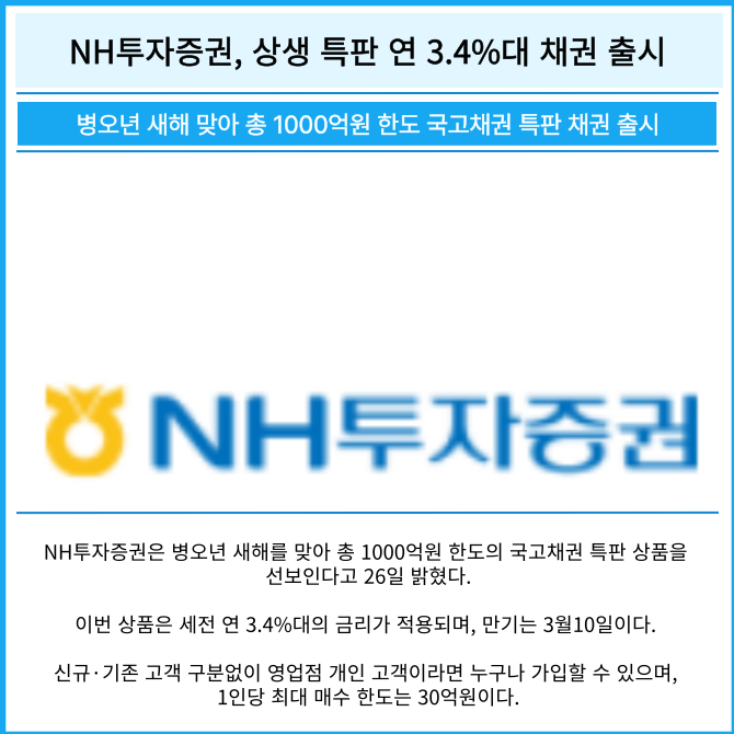 [프라임경제] NH투자증권은 병오년 새해를 맞아 총 1000억원 한도의 국고채권 특판 상품을 선보인다고 26일 밝혔다.