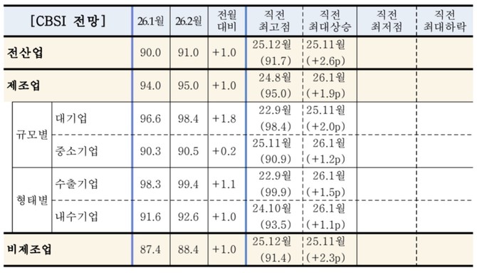 내달 CBSI 전망치는 전월 대비 1.0p 상승한 91.0으로 조사됐다. 제조업은 1.0p 오른 95.0로 전망됐다. 지난 2024년 8월(95.0) 이후 최고치다. 비제조업도 1.0p 상승한 88.4을 기록했다.
