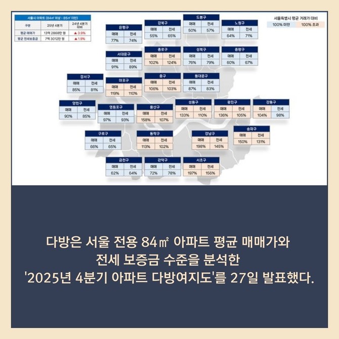 [프라임경제] 다방은 서울 전용 84㎡ 아파트 평균 매매가와 전세 보증금 수준을 분석한 '2025년 4분기 아파트 다방여지도'를 27일 발표했다.