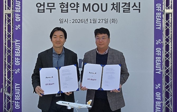 [프라임경제] 에어로케이항공은 27일 도심형 코스메틱 아울렛 오프뷰티와 업무협약(MOU)을 체결하고, 항공 이용 고객을 위한 라이프스타일 제휴 서비스를 본격 강화한다고 밝혔다.