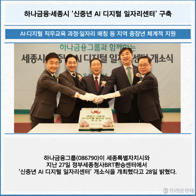 [프라임경제] 하나금융그룹(086790)이 세종특별자치시와 지난 27일 정부세종청사BRT환승센터에서 '신중년 AI 디지털 일자리센터' 개소식을 개최했다고 28일 밝혔다.