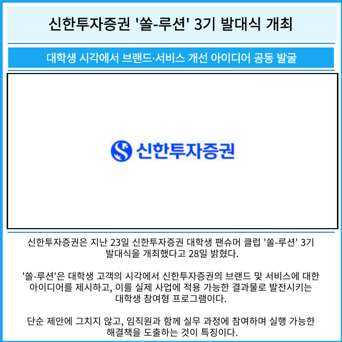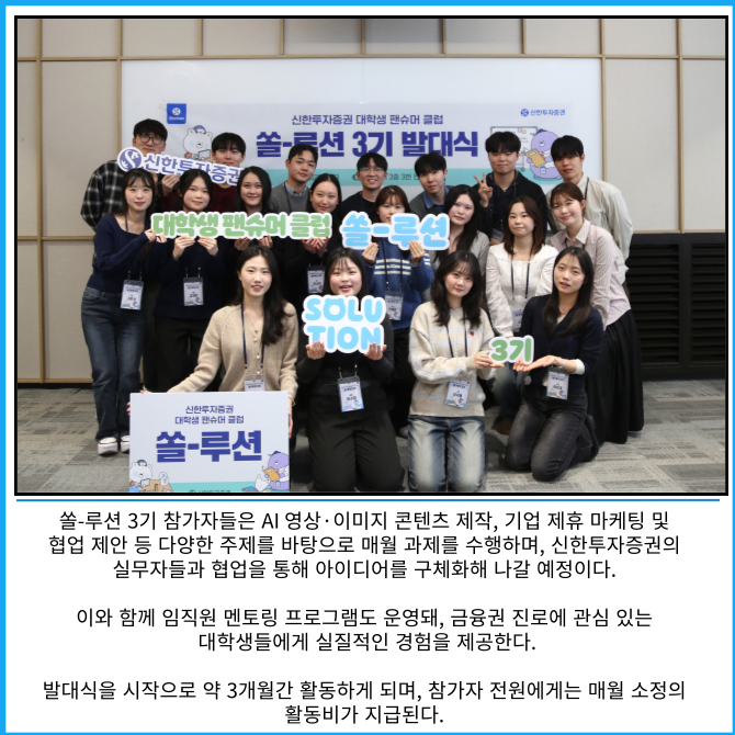 [프라임경제] 신한투자증권은 지난 23일 신한투자증권 대학생 팬슈머 클럽 '쏠-루션' 3기 발대식을 개최했다고 28일 밝혔다.