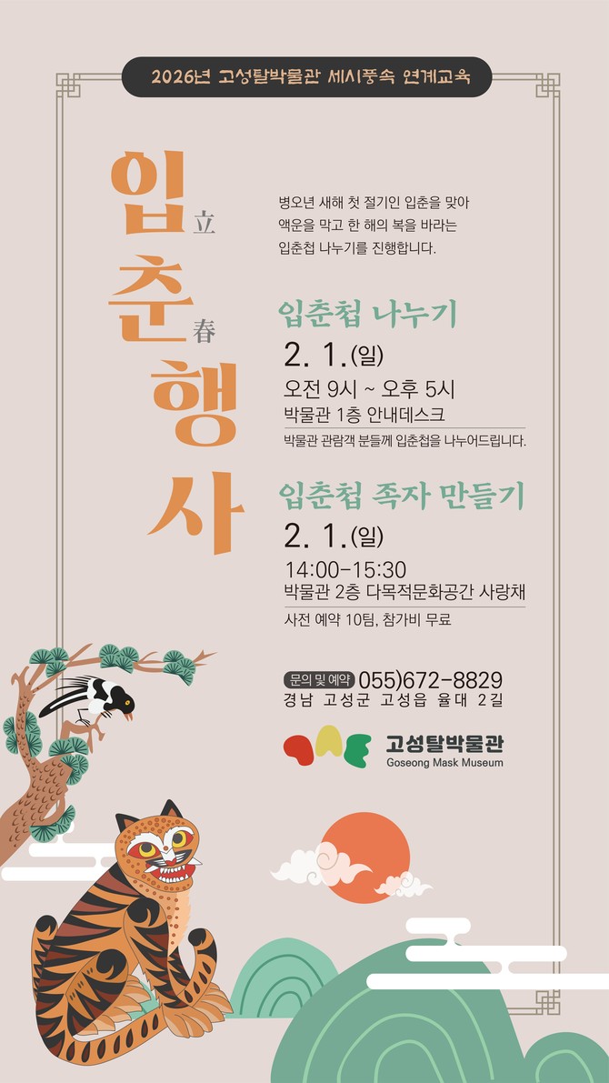 고성탈박물관 관계자는 "새해를 맞아 건강하고 행복한 한 해를 보내길 바라는 전통 세시풍속을 함께 나누기 위해 행사를 열게 되었다"며 "이번에 전면 리모델링을 한 박물관도 구경하고 입춘첩도 만들어보는 가족 프로그램에도 많은 참여를 바란다"고 말했다.