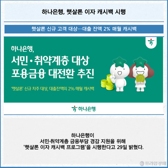 [프라임경제] 하나은행이 서민·취약계층 금융부담 경감 지원을 위해 '햇살론 이자 캐시백 프로그램'을 시행한다고 29일 밝혔다.