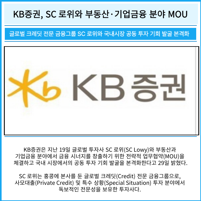 [프라임경제] KB증권은 지난 19일 글로벌 투자사 SC 로위(SC Lowy)와 부동산과 기업금융 분야에서 금융 시너지를 창출하기 위한 전략적 업무협약(MOU)을 체결하고 국내 시장에서의 공동 투자 기회 발굴을 본격화한다고 29일 밝혔다.