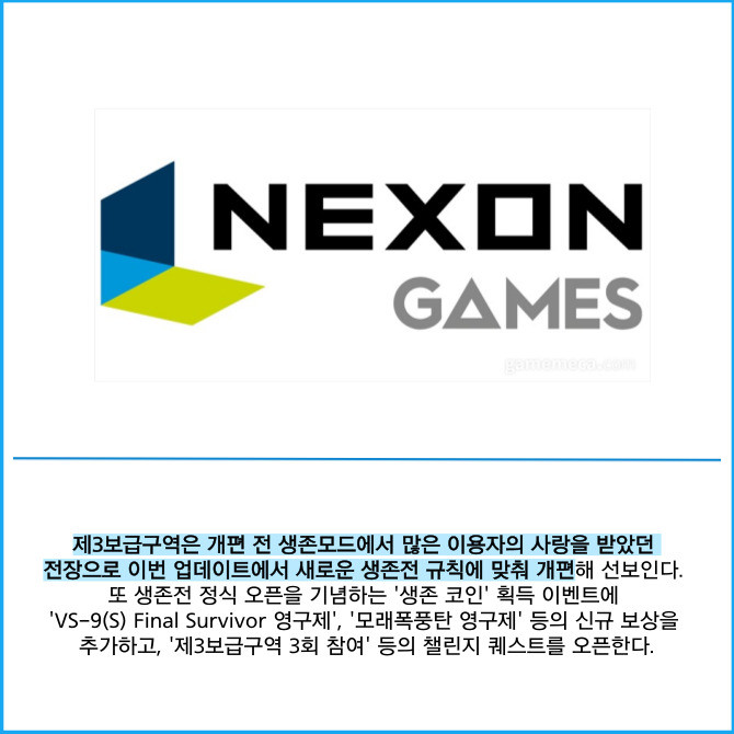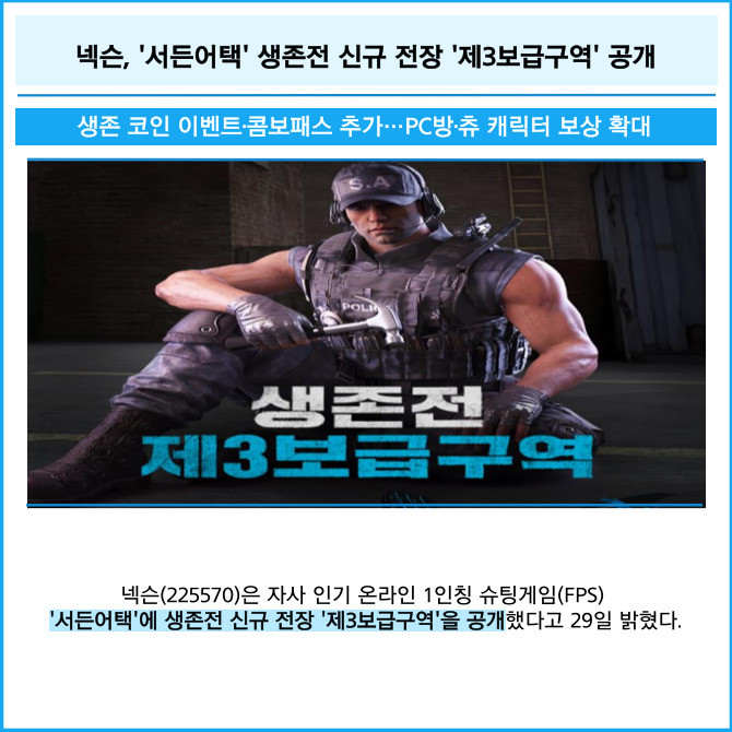[프라임경제] 넥슨(225570)은 자사 인기 온라인 1인칭 슈팅게임(FPS) '서든어택'에 생존전 신규 전장 '제3보급구역'을 공개했다고 29일 밝혔다.