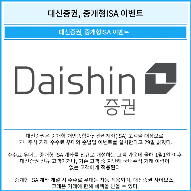 [프라임경제] 대신증권(003540)은 중개형 개인종합자산관리계좌(ISA) 고객을 대상으로 국내주식 거래 수수료 우대와 순납입 이벤트를 실시한다고 29일 밝혔다.