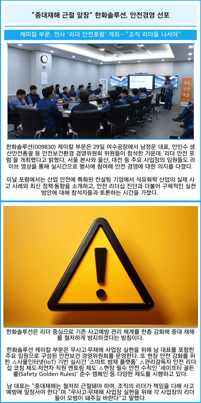 [프라임경제] 한화솔루션(009830) 케미칼 부문은 29일 여수공장에서 남정운 대표, 안인수 생산안전총괄 등 안전보건환경 경영위원회 위원들이 참석한 가운데 '리더 안전 포럼'을 개최했다고 밝혔다.