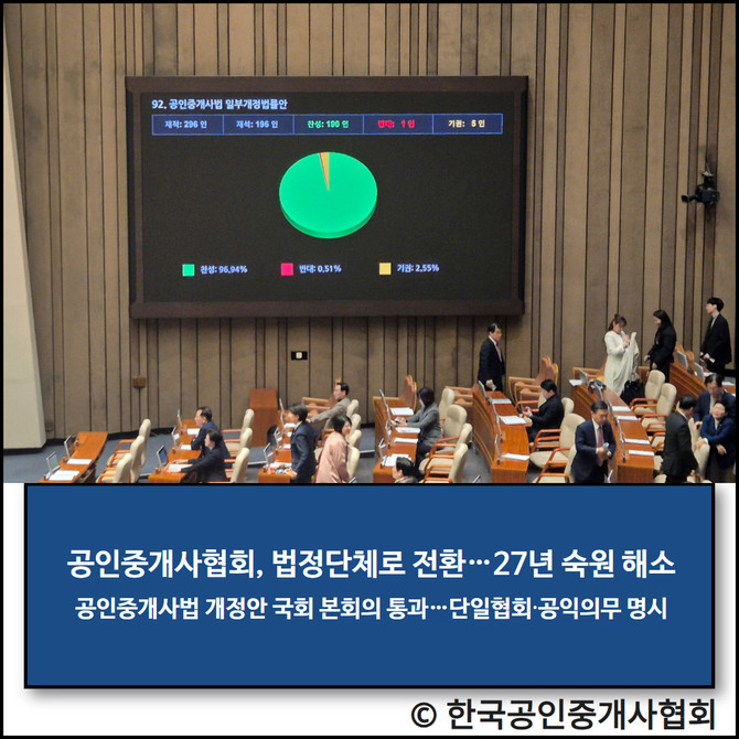 한국공인중개사협회(이하 협회)는 법정단체 전환을 골자로 한 '공인중개사법 일부개정법률안'이 국회 본회의를 통과했다고 29일 밝혔다.