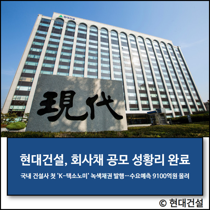 이번 채권은 국내 건설사 최초 K-택소노미(한국형 녹색분류체계) 기준 녹색채권(ESG채권)이다. 이는 기존 국제자본시장협회(ICMA)에 비해 한층 강화된 기준이 적용된다. 현대건설은 21일 수요예측에서 9100억원이 넘는 주문을 받아 목표액의 5배가 넘는 자금 확보에 성공했다.